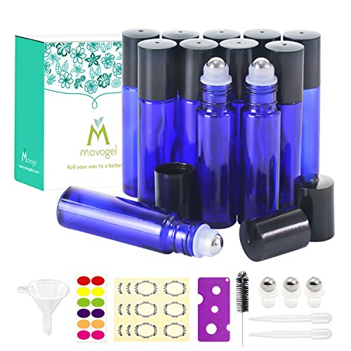12,10ml Roller Bottles for Essential Oils - Cobalt Blue, Glass with Stainless Steel Roller Balls by Mavogel ( 3 Extra Roller Balls, 30 Pieces Labels, Opener, Funnel, Dropper, Brush Included)