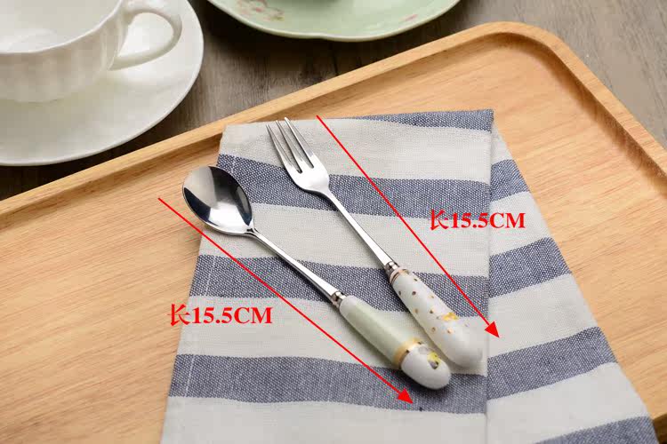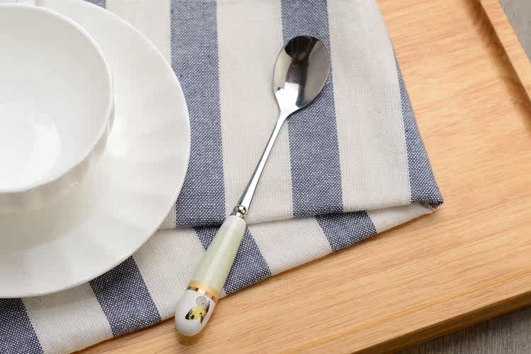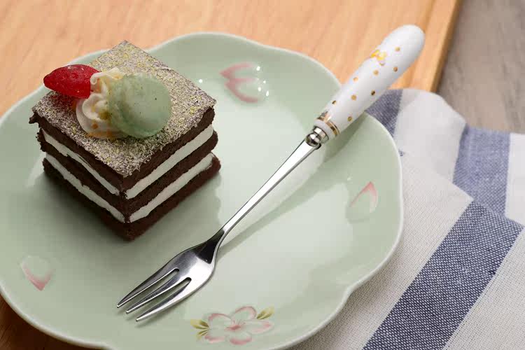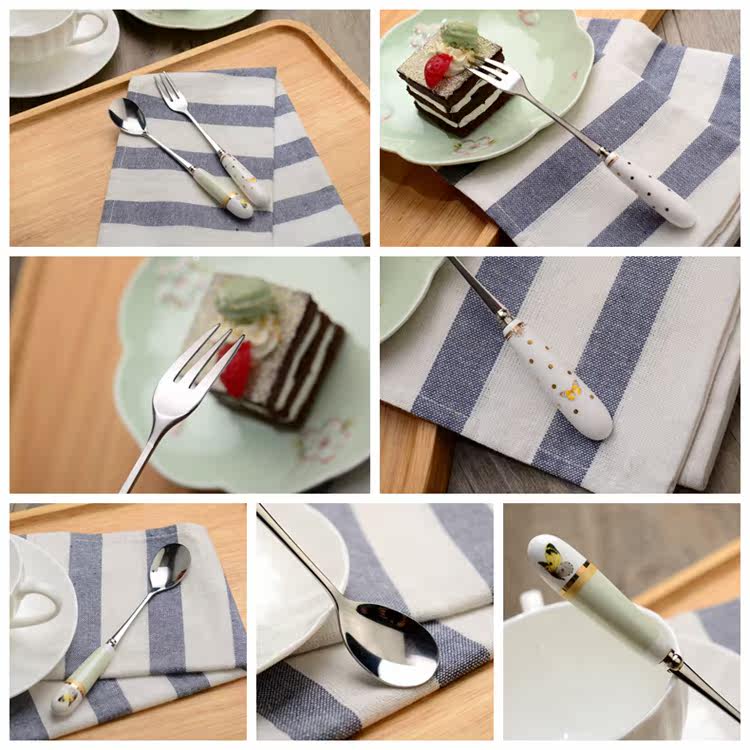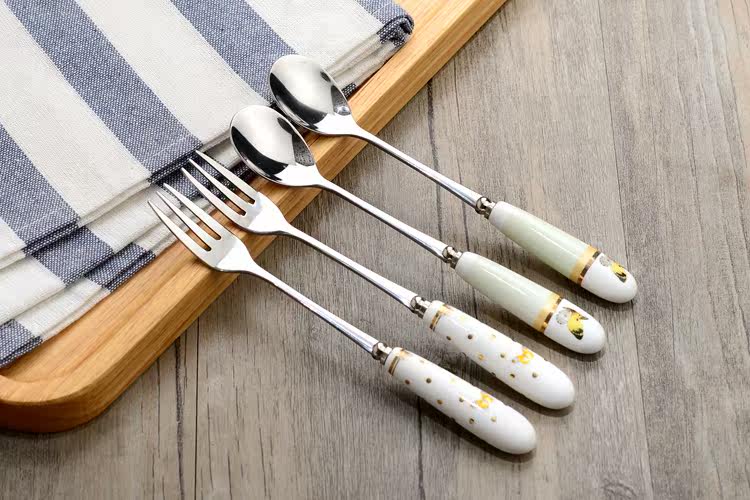 可爱创意家用陶瓷柄不锈钢叉子饭勺西瓜勺雪糕勺餐勺 西餐勺子叉