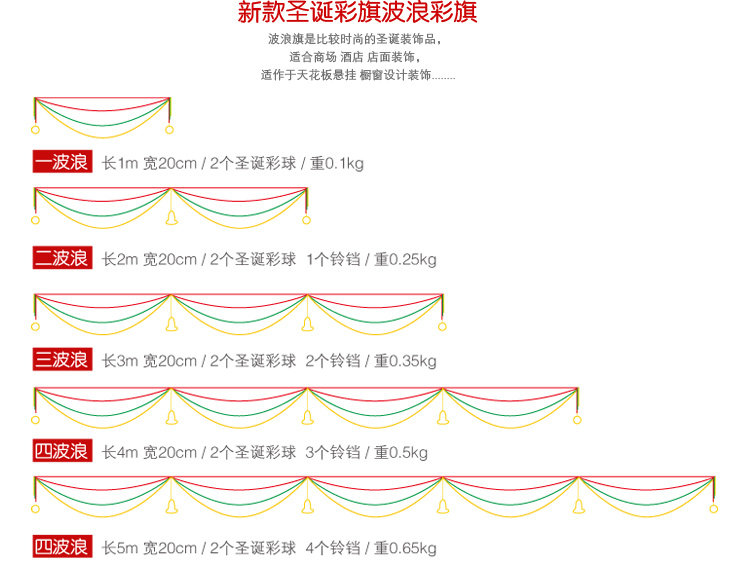 5 Waves = Length 500 CM * Width 20 CM + 2 pcs Christmas ball + 4 pcs Bell
