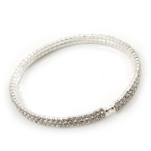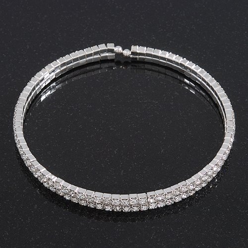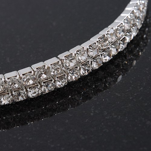 Simply breathtaking, this dramatic 2-Row Clear Swarovski Crystal Flex Choker Necklace In Rhodium Plating is certainly a showstopper. Featuring a flex choker design, made of two rows of claw-set clear Swarovski crystals, offering a head-turning sparkle and set in rhodium plating. Stretchy flex construction expands to fit comfortably around your neck. About 1cm in width and 32cm in length in still position. A beautiful necklace to wear for special occasions, weddings and ideal bridal jewellery for brides and bridesmaids. Also, check our store for a matching bracelet BR02025 and earrings E02144.Feature