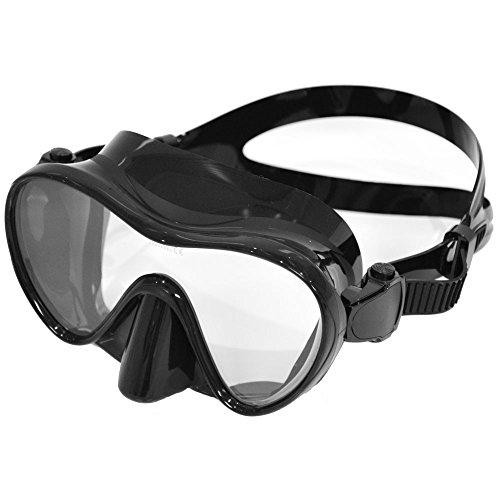 Single-lens scuba mask featuring a unique assembly of lens and frameless skirt. Reduced weight, size and volume make clearing water easy. New push-button buckle allows for easy, quick strap adjustment. Tempered glass lens.