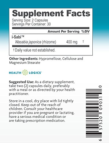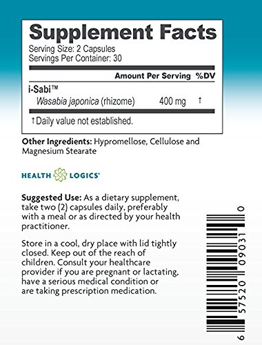 -. Binding : Health and Beauty -. Brand : Health Logics -. EAN : 0657520090310 -. Feature : Wasabi is widely known for its use as an accompanying condiment with sushi / It is used to add sharp flavor and spice to traditional Japanese dishes which is why it is universally associated with Japanese cuisines by most sushi lovers / What most sushi lovers along with the general population aren't aware of is the many health benefits that pure Wasabi possesses -. Label : Health Logics -. LegalDisclaimer : These statements have not been evaluated by the Food and Drug Administration. This product is not intended to treat, cure, or prevent any disease. -. Manufacturer : Health Logics -. Model : 09031 -. MPN : 1000600 -. NumberOfItems : 1 -. PackageQuantity : 1 -. PartNumber : 1000600 -. ProductGroup : Health and Beauty -. ProductTypeName : HEALTH_PERSONAL_CARE -. PublicationDate : 2014-12-10 -. Publisher : Health Logics -. ReleaseDate : 2014-12-07 -. Size : 60 Capsules -. Studio : Health Logics -. Title : i-Sabi Wasabi Supplement Vegetarian Capsules, 60 caps -. UPC : 657520090310