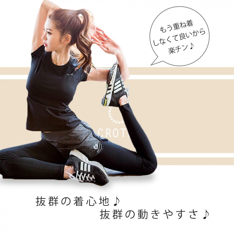 レギンスはブラックで美脚、着圧効果も期待できます。