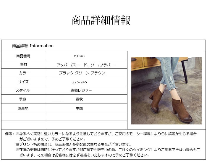 ベーシックだけどトレンド感を取り入れたい。秋冬コーデに使えるおしゃれな太めヒールブーツが登場♪太めのハイヒールがデザインと調和してカジュアルで大人な雰囲気♪つま先は細目で女性らしいキレイなラインを強調してくれる。カジュアルにもフェミニンにも対応できるレディースブーツ必見♪これから冬にかけて活躍間違いなし!■素材:アッパー/スエード、ソール/ラバー■カラー:ブラック/グリーン/ブラウン■サイズ:225 230 235 240 245?■原産地:中国