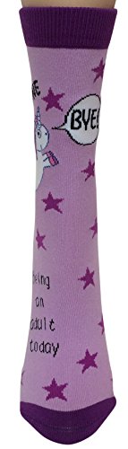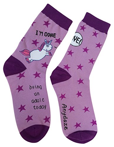 -. Feature : Leaping unicorns and stars! Do you long for the simplicity and ease of being a child with few responsibilities? Our "I'm Done Being an Adult Today" socks let you take a break from being an adult. The unicorn even says "Bye" to adulthood. These socks are also special because there is a right sock and left sock. This means that you have the saying on the outside of both feet. / Let us brighten your day and make it suck a little less. The best of fun, quality, and comfort! / Comfortable SmoothToe seam. What is SmoothToe (aka seamless toe)? It's just the most comfortable thing around. You know that toe seam you adjust so it doesn't irritate you or your toes, especially with shoes? Our SmoothToe minimizes that seam so you almost don't realize you're wearing socks. It's so comfortable. Just put them on and don't think about them again. Seriously....once you try SmoothToe seam you won't want to wear other socks. / Made with Combed Cotton. Combed cotton is softer and more durable than regular cotton. It's also great for sensitive feet and doesn't wear out as quickly as uncombed cotton. / 80% Combed Cotton/17% Nylon/3% Spandex. Fits women's US shoe size 5-10. Machine wash warm, tumble dry low.