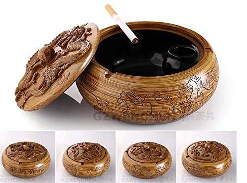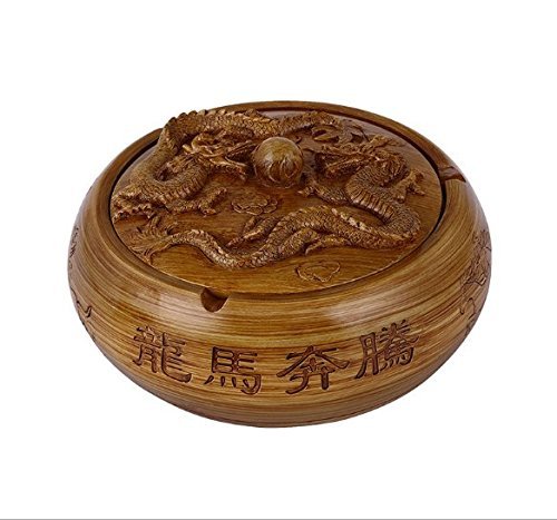 -. Feature : Dragon Ashtray with Lid,looks like wooden finished. with the delicate carvings on it , Material:Polyresin. / Large capacity,Can hold up to 3 packets of cigarette butts,SIze:15*15*8.6 CM / With Chinese characters, Sculptural Dragons,Put it on you desk , looks Elegant and graceful. / Good Gift:Ideal retro tabletop ornament for office,home,KTV,cafes,hotel/A special gift for Birthday,Anniversaries,Christmas/Particularly designed for smokers and antique decor enthusiasts / It is Handicraft,with two dragons on the top and horses on the body.