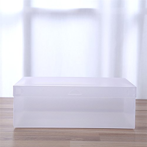 - Color: Transparent. - Material: PP. - Size: 28x18x10cm / 11x7x3.9inch. - You can see the shoes inside without opening the box. - Ideal for home, office or dorm room uses. - Keep clean each kind of footwear during trip-slippers, sneakers, and shoes. - Durable plastic boxes protect shoes from dust andamp; moisture. - Visible clear plastic storage box allows for easy identification of contents.