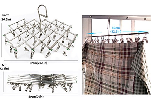 -. Feature : SMART HOOK DESIGN - Integrated hanging hook is as easy to use as a clothes hanger! Fits most clothes closet or shower rod! (This hanger is suitable for clothesline diameter within 4 cm)Easy latching safety lock prevents the hook from accidentally falling off when suspended in breezy areas or strong gusty winds. Hanging design saves valuable floor space while saving money on drying costs. / STURDY STRUCTURE - Durable construction with superior quality welding designed to last a lifetime. The hanger is made of stainless steel that is anti-UV and not easy to aging. Drying frame and shelves in particular use 202 waterproof stainless steel, wire sP.R.Ing is nickel rust that is anti-rust. Solid rivets have good load capacity. / WELL-DESIGNED - Drying rack use folding design, the hook can be swiveled 180 degree that is easy to storage, which can reduce 80% of occupied space. Plastic wrap is to avoid bring scratches by stainless steel that is for security. / MULTI-FUNCTION: This folding hanger can not only clip socks, gloves and other small items, but also adult clothing, towels and diapers. The hanger can easily clip coverlets or curtains through stretch it. / CONVENIENT LIFE - The hanger has another free 15 clips in same quality and you can either use it as replacement or to clip other clothing. When you find stain on rack, as long as timely rub with a rag, it will be clean as new.