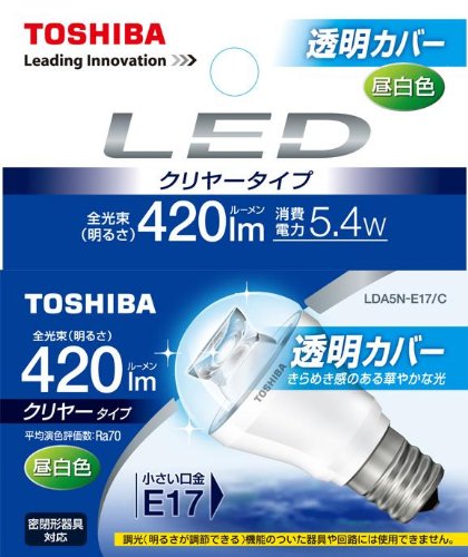Weight / 42 g ● Light source color / Day white color ● Glove type / Clear ● Cap / E17 ● Frequency 50 / 60Hz ● Rated input voltage / 100V ● Rated power consumption / 5.4 W ● Rated input current / 95 mA ● Total flux / 420 lm ● Maximum luminous intensity