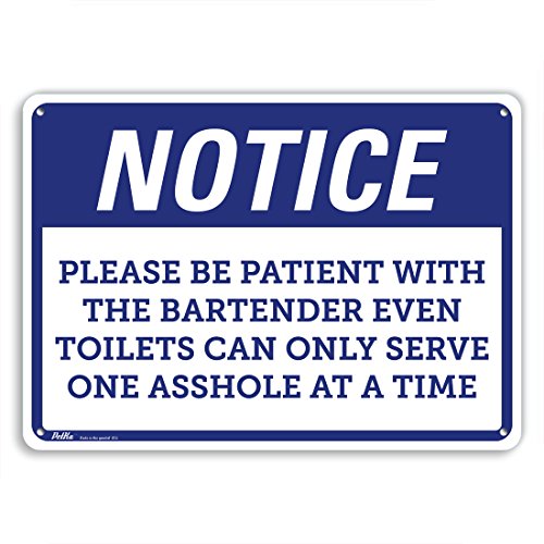PetKa Signs and Graphics PKFS-0041-NA_10x7 "Notice Please Be Patient With The Bartender Even Toilets Can Only Serve One Asshole At A Time" Aluminum Sign, 10" x 7", Blue on White