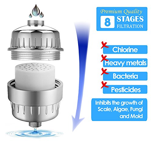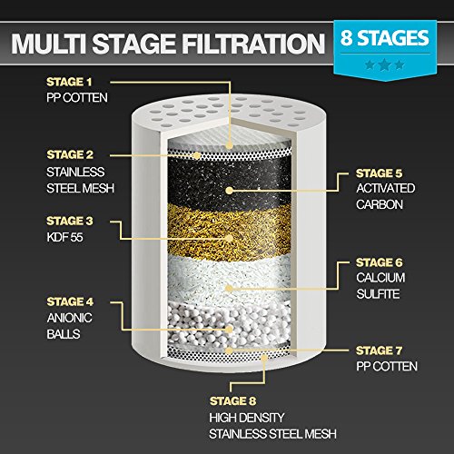 - ★ 8-STAGE FILTRATION - Luxsego filter cartridge including Active Carbon, High-purity KDF 55, Anionic Mineral Balls, Calcium Sulfite and PP Cotton, High Density Stainless Steel Mesh on both sides. 8-Stage filter guarantee, improve your shower experience.