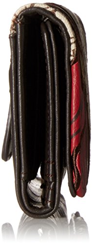 The wallet's charming design is made of canvas and features a faux-leather trim and embroidered and printed applique details.