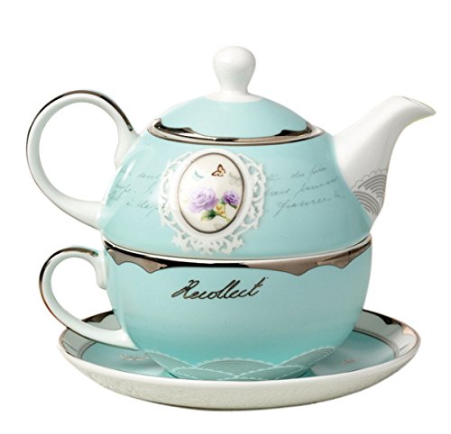 -. Title : Jusalpha Bone China Blue Teapot for One, Teapot and Saucer Set, Turquoise Gold (Teapot Set 03)