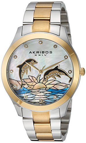 Akribos XXIV Women's Two-Tone Case with Genuine Swarovski Crystals and White Mother-of-Pearl with Dolphin Dial on Two-Tone Stainless Steel Bracelet Watch AK953DTTG