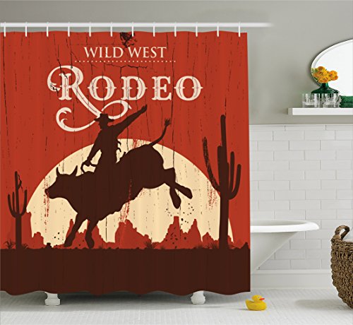 Vintage Shower Curtain by Ambesonne, Rodeo Cowboy Riding Bull Wooden Old Sign Western Wilderness at Sunset Image, Fabric Bathroom Decor Set with Hooks, 75 Inches Long, Redwood Orange