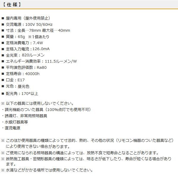 小形電球60形相当の明るさ。密閉形器具/断熱材施工器具対応。光色は昼光色で2個入りです。
