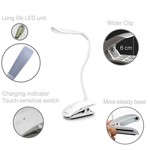 -. Title : Cordless Clip Desk Lamp - 14 Long Life LEDs - Built-in 500mAh Rechargeable Lithium Battery - 3 Brightness Level Touch Dimmer - Portable Lightweight for Indoor & Outdoor Use