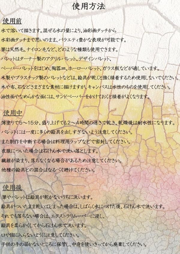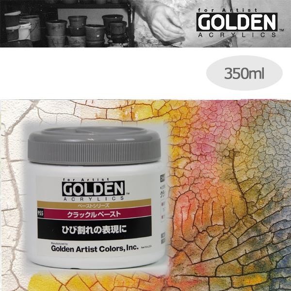 【ご注意】 ●粘着性が低いため、必ず下地にGOLDEN社のジェッソを塗布してからお使いください。 ●乾燥過程で大きく収縮しますので、紙やキャンバスに直接塗布すると下地がたわみ、めくれ・剥がれの原因となる場合がございます。そのような下地の場合は、木・ボードなど硬い素材に貼り付けるか、キャンバスであれば枠にしっかりと張り、GOLDEN社のジェッソを塗布してから使用してください。 ●クラックは量や気温・湿度などにより、出来上がりが異なります。予めテスト塗布を行い、クラックの状態を確認してください。 ●水で薄めないでください。粘着性が低下し、剥がれの原因になります。10%以内であれば、GOLDEN社の絵具・メディウムなどと混合できますが、クラックは小さくなります。 |