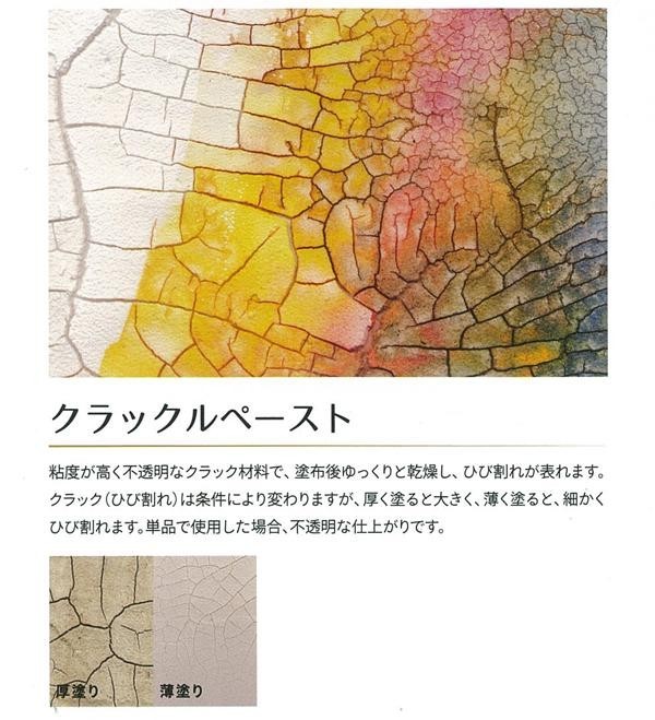 | 粘度が高く不透明なクラック材料で、塗布後ゆっくりと乾燥し、ひび割れが表れます。クラック(ひび割れ)は条件により変わりますが、厚く塗ると大きく、薄く塗ると細かくひび割れます。単品で使用した場合、不透明な仕上がりです。 |