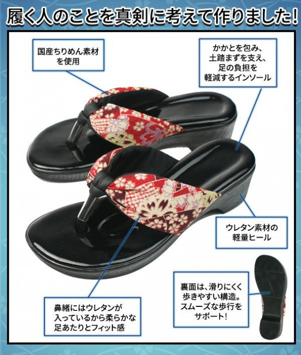 おしゃれな下駄とサンダルの歩きやすさを併せ持った和風のサンダルです。一般的な下駄とは異なり、柔らかいウレタン素材を使用している為、軽くて長時間履いても足への負担が少ないのが魅力!!鼻緒は国産ちりめん素材を使用。浴衣にも、普段の洋装にも、可愛く合わせて頂けます。 |