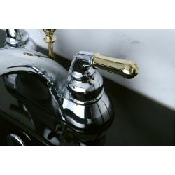 -. Feature : Faucet type: Bathroom Number of handles: Double-handle Faucet finish: Chrome and brass / Faucet style: Centerset Handle shape: Lever Spout reach: 5 inches / Spout height: 4 inches , 2.0 GPM flow rate / All mounting hardware included Drip-free washerless cartridge / Includes drain assembly in matching finish