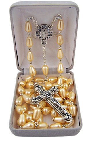 Catholic Cream Oval Tear Drop Prayer Bead Rosary Necklace with Heart Detailed Crucifix, 32 Inch
