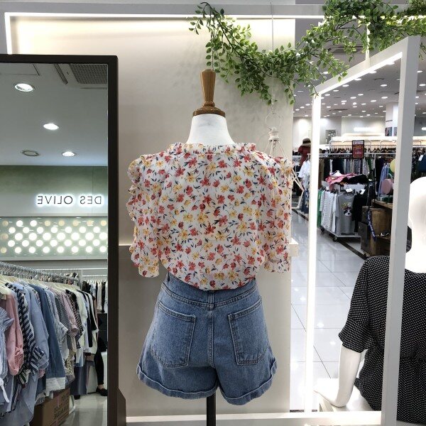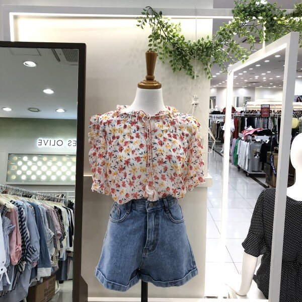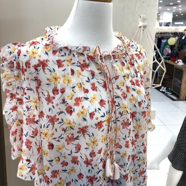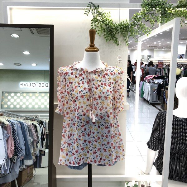 화려한 색감의 꽃프린팅 블라우스 입니다^^ 넥라인과 소매부분 프릴로 발랄함을 더하고 리본끈이 여러색깔로 겹쳐져 색다른 느낌을 준답니다~ 화사하게 입고 싶은 날에 안성맞춤이에요!