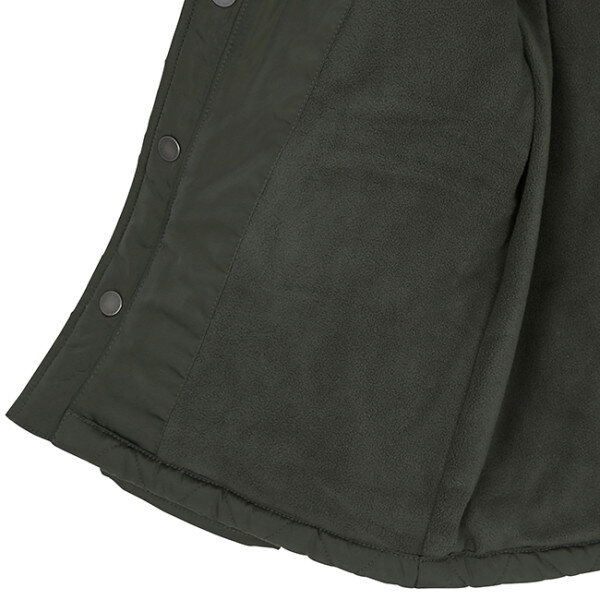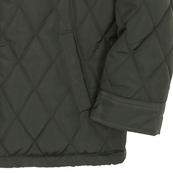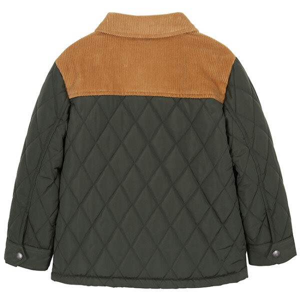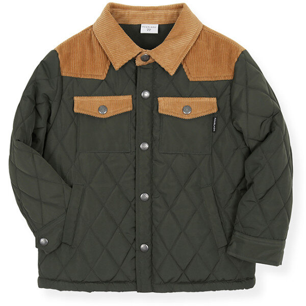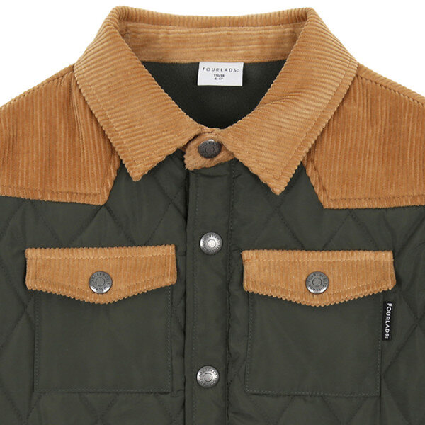 퀄팅 패딩 쟈켓이에요. 카키 컬러 쟈켓으로 골덴원단을 매치해서 단정한 느낌이에요. 겉옷으로 코디해도 좋고 캐주얼하게 코디해도 좋습니다.