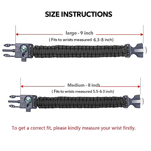 WRIST SIZES - The paracord survival bracelet is available in 2 different sizes: Larger 9 inches and Medium 8 inches. Large bracelet fits wrists measured 6.3-8 inches; Medium fits wrists measured 5.5-6.3 inches.