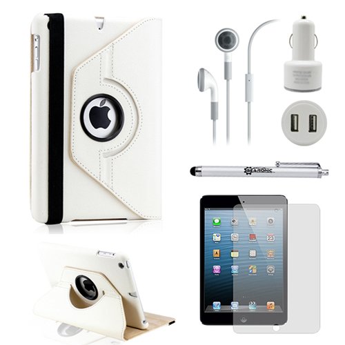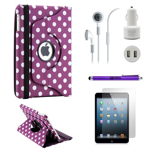 Enjoy your New Apple Mini with complete protection and convenience with this 5-in-1 casual travel business vacation accessories bundle. The case is made of high quality PU leather material for great shock-absorbing, tear-resistant, anti-scratch, and anti-fingerprints protection. The snap on hard PC back case allows the tablet to be rotated 360 degree with the unique swivel design that provides different viewing or typing angles in horizontal or vertical positions. The elastic band closure front cover with smart cover sleep/wake function holds the case closed securely without the risk of it slipping out accidentally. Full access to all ports, buttons, and cameras on the tablet without the need to remove the case. 4 accessories are included for your inconvenience. For Apple iPad Mini and 2013 iPad Mini with Retina Display ONLY.