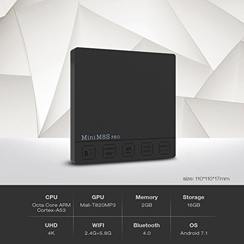 -. Feature : Android 7.1 System:MINI M8S PRO is running Android 7.1 System. Rapid, stable configuration coupled with the highly customized Android 7.1 System. Watching TV shows, movies; browsing webpage and photos, and playing android games as many as you like. / Amlogic S912:Amlogic S912, which is a high performance octa-core 64bit chipset which is known for a maximum speed up to 2.0GHz, as well as Mali-T820MP3 GPU, the quality configuration provides you with ultra-fast running speed and professional graphic processing ability. / 2.4G+5.8G WIFI:It supports 2.4G/ 5.8G Dual-Band Wi-Fi with BT 4.0, also supports max 100M Ethernet and seconds to open applications. 2GB memory and 16GB storage for you to enjoy the smooth streaming and download your favorite apps, to browse websites, play games, run apps and watch movies. / Optimization Design:Simple and practical interface design, get quick access to your favoriate apps by one-click. Available for Web browser, emails, moveis, musics, pictures. Download apps easily in Play Store&Apps, no third-party apps are installed, completely pure space. / H.265 HD decoding:Based on H.265 HD decoding, it offers 4k * 2k output which provides you high definition viewing and fluent video playing. You can view every single detail on the picture, and experience the real color in the world.