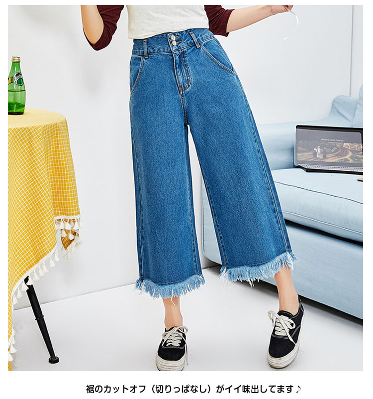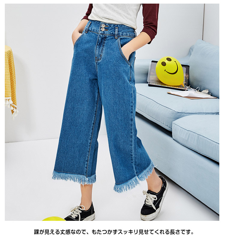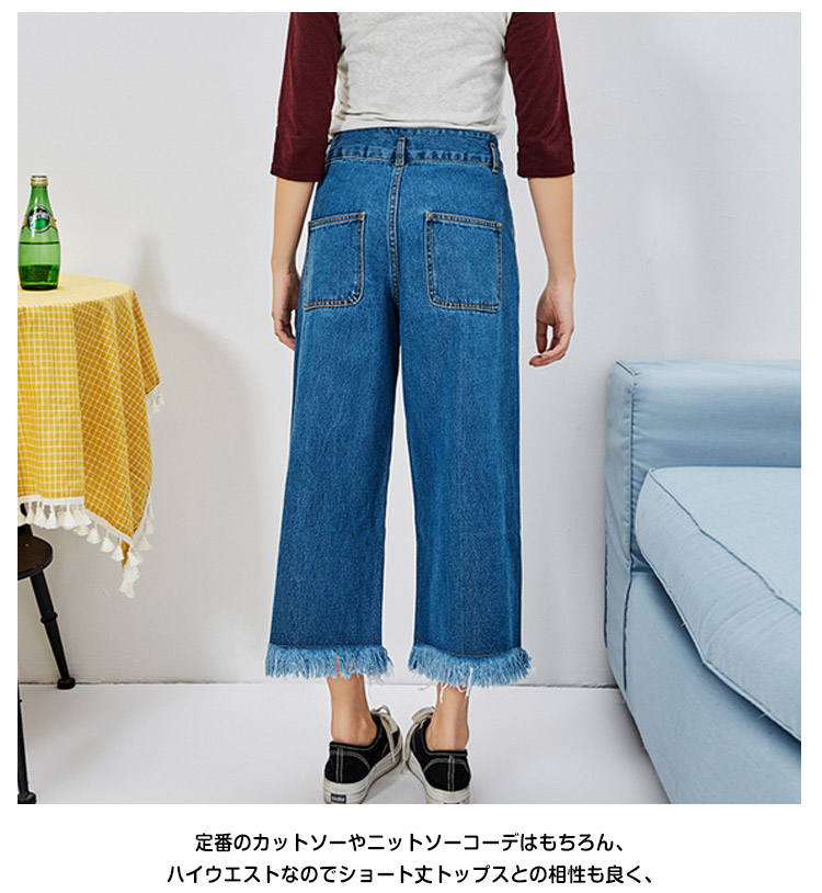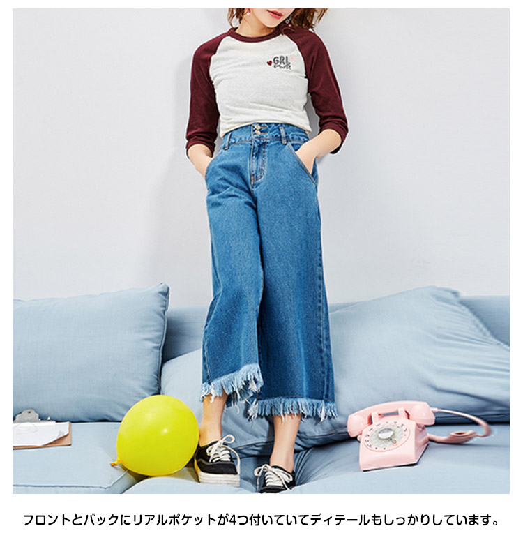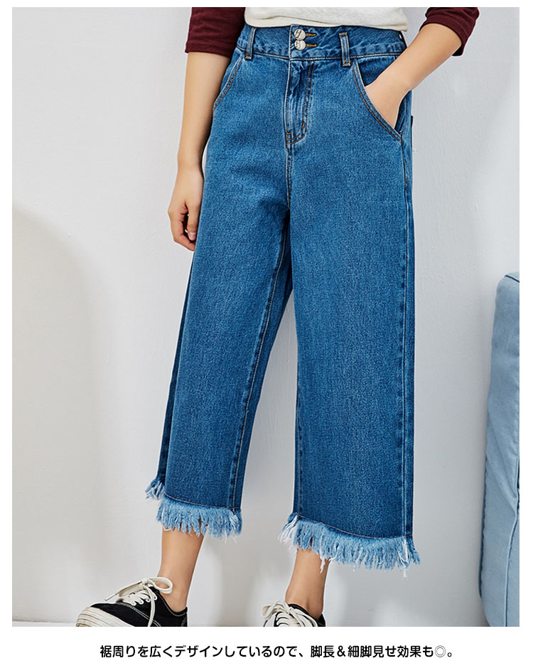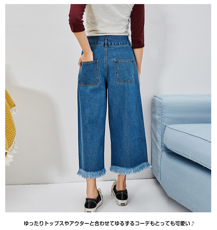 | トレンドのガウチョパンツにデニム生地タイプが新登場!踝が見える丈感なので、もたつかずスッキリ見せてくれる長さです。フロントとバックにリアルポケットが4つ付いていてディテールもしっかりしています。裾のカットオフ(切りっぱなし)がイイ味出してます♪裾周りを広くデザインしているので、脚長&細脚見せ効果も◎。定番のカットソーやニットソーコーデはもちろん、ハイウエストなのでショート丈トップスとの相性も良く、ゆったりトップスやアウターと合わせてゆるずるコーデもとっても可愛い♪ | |