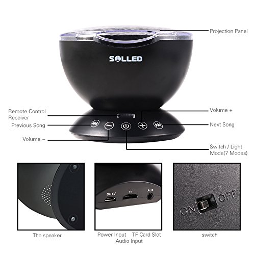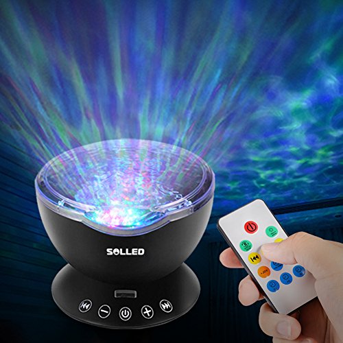 [Newest Design] SOLLED Remote Control Ocean Wave Projector 12 LED & 7 Colors Ocean Night Light with Built-in Mini Music Player for Living Room and Bedroom (Black)