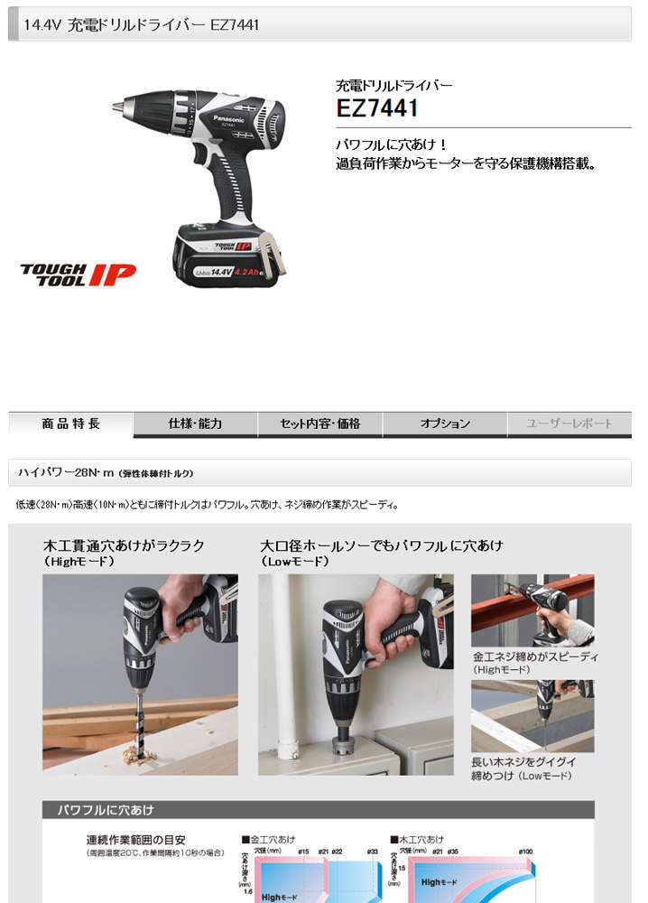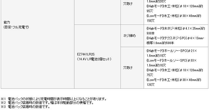 ●締め付け能力:高速モード:木ねじ・米松(φ4.1×25mm)約1200本、穴あけ:高速モード:木工・米松(φ18×120mm)約95穴