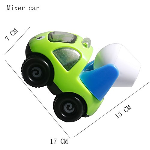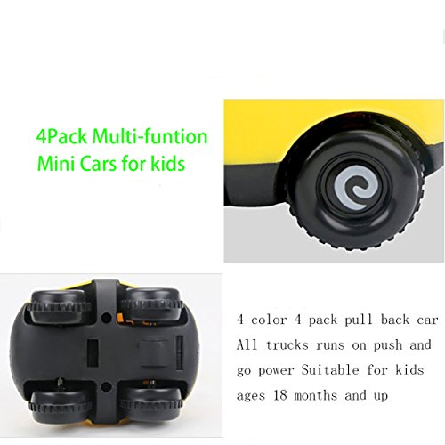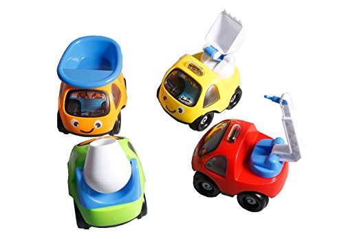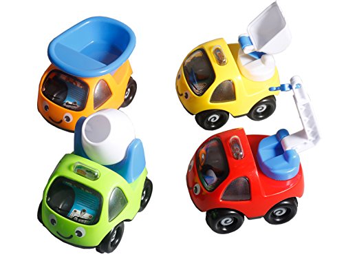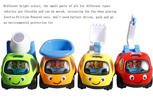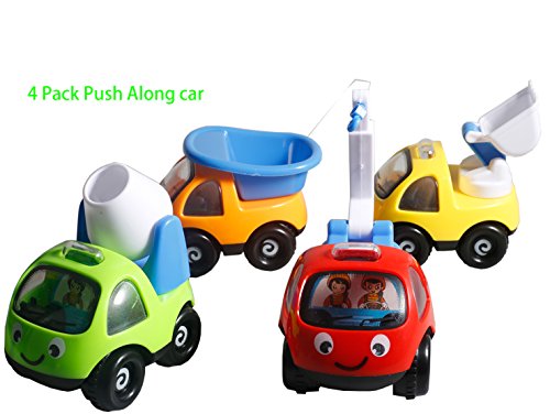 4pack different mini push car. They are cement truck, digging truck, loading truck, hanging material car.Any kid who loves trucks will love this sets. All trucks runs on push-and-go power. Suitable for children ages 18 months and up.