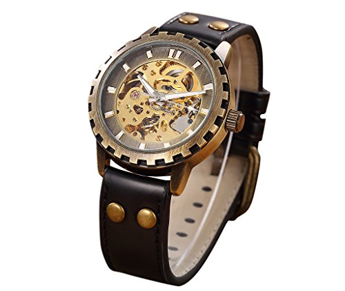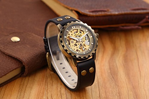 -. Feature : GuTe-picked Retro Steampunk Mechanical Watch Unisex Style / Retro Brass Watch Case / Skeleton See throught Watch Dial with Luminous Automatic / Gear Bezel, Black PU Strap with Brass Buckle / GuTe Minimalist Kraft Watchbox ECO-friendly Packaging for You