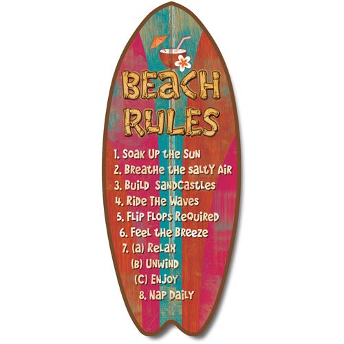 Here is a cute distressed turquoise, pink and orange surfboard plaque featuring the "Beach Rules" adorned by a fruity drink. Sure to add coastal flair and humor to your home's decor. According to the Surf Shack, the Beach Rules are as follows: 1. Soak up the sun 2. Breathe the salty air 3. Build sandcastles 4. Ride the waves 5. Flip flops required 6. Feel the breeze 7. a) Relax, b) Unwind, c) Enjoy 8. Nap daily This piece measures 18 by 7.5 inches and is made of wood.