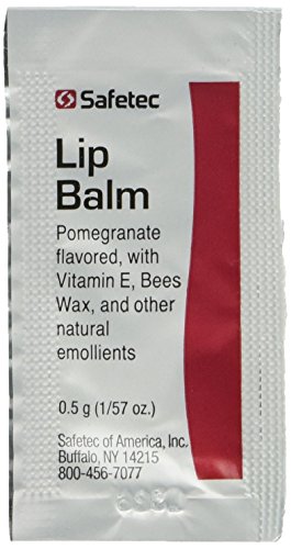 -. Binding : Health and Beauty -. Brand : Safetec -. Feature : Pomegranate flavored lip balm in 144 convenient foil packets for travel, purses, everywhere you go. / Use to soothe and hydrate dry lips. / Contains Vitamin E, Bees Wax, Coconut Oil and other natural emollients. / Never be without lip balm again. / Great scent and taste. -. Label : Safetec -. Manufacturer : Safetec -. ProductGroup : Health and Beauty -. ProductTypeName : HEALTH_PERSONAL_CARE -. Publisher : Safetec -. Studio : Safetec -. Title : Lip Balm Pomegranate Flavored - 144 or 288 Packets/box (.5 gm each)