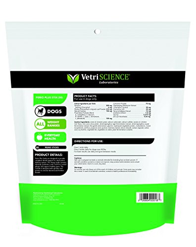 -. Binding : Misc. -. Brand : VetriScience Laboratories -. Department : dog-treats -. EAN : 0026664000187 -. Feature : A no stress, no mess, no hassle daily dental program / Easy to give due to its great taste and smell / A guilt-free way to support periodontal health / Packaging May Vary -. Label : Vetri-Science Laboratories -. Manufacturer : Vetri-Science Laboratories -. Model : 090019A.030 -. MPN : 090019A.030 -. NumberOfItems : 1 -. PackageQuantity : 1 -. PartNumber : 090019A.030 -. ProductGroup : Pet Products -. ProductTypeName : PET_SUPPLIES -. Publisher : Vetri-Science Laboratories -. Size : 30 count -. Studio : Vetri-Science Laboratories -. Title : VetriScience Laboratories - Perio Plus Dental Stix Health Care Supplies for Dogs -. UPC : 026664000187