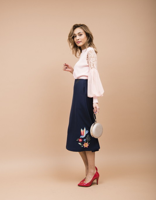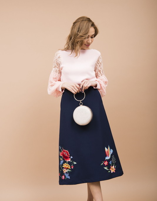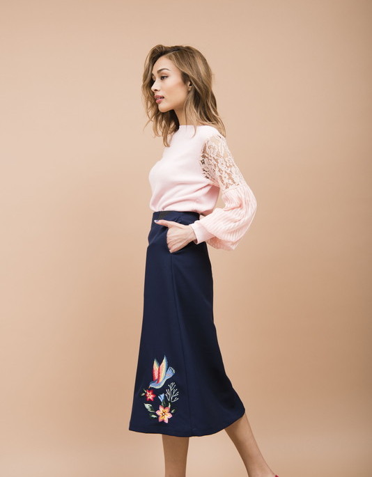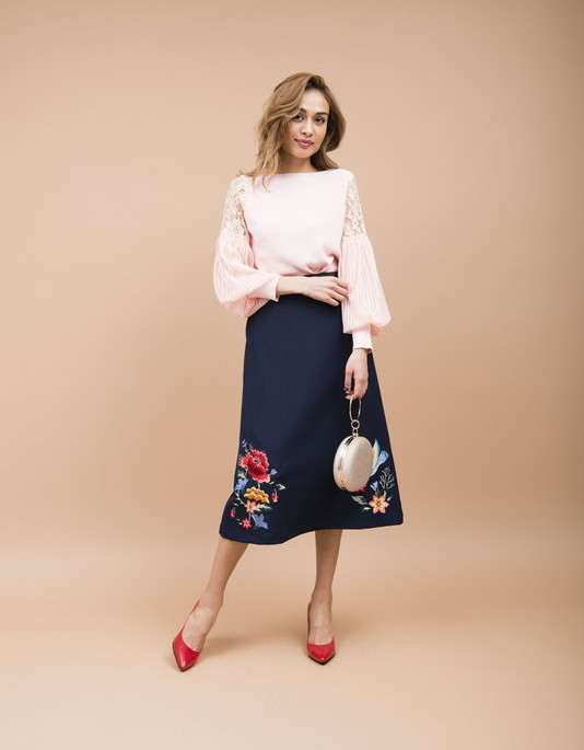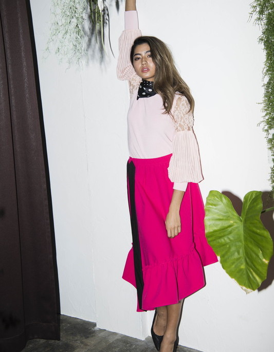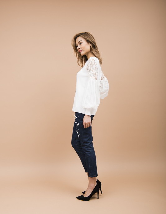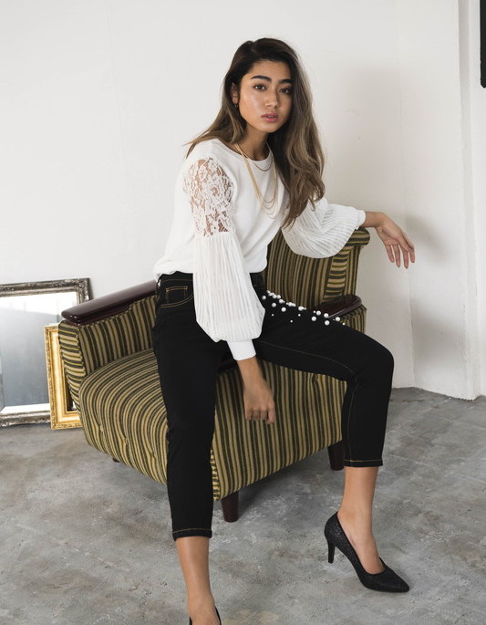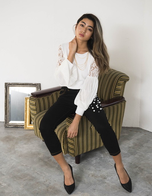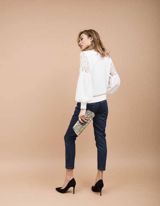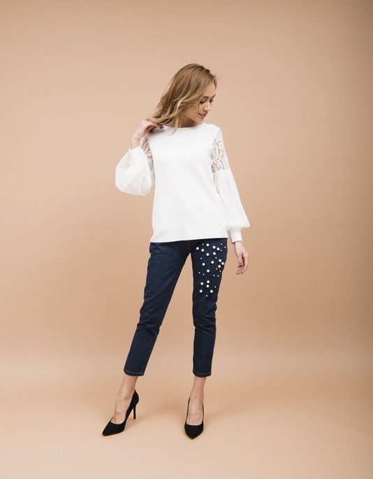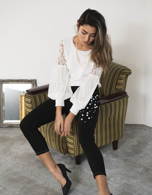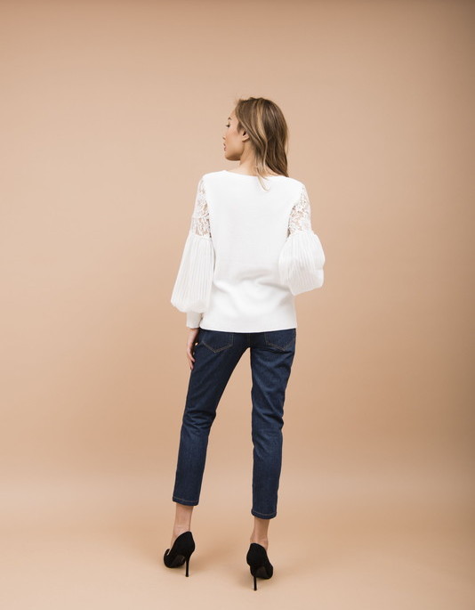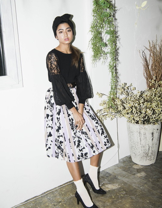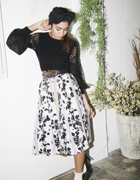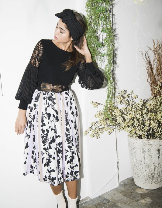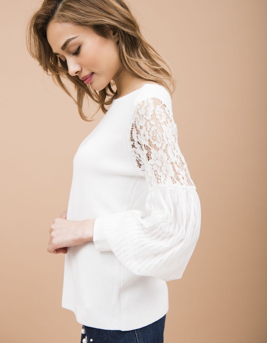 シンプルなクルーネックのニットの袖を花柄レースとストライプの透け感のある生地でバルーンにしたオシャレTOPS!BODYは程良いサイズ感なのでボトムを選ばない優れものです☆