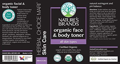 Nature's Brands' Herbal Choice Mari face and body toner is USDA Certified Organic. This antioxidant rich, naturally hydrating toner helps neutralize the pH balance of your skin, leaving it more supple and younger looking. This balancing toner works great on all skin types, including sensitive skin. Can be sprayed on the face and body.Feature