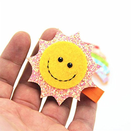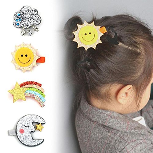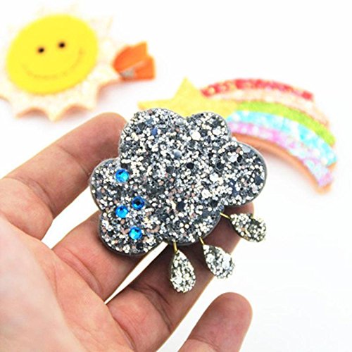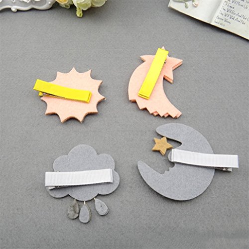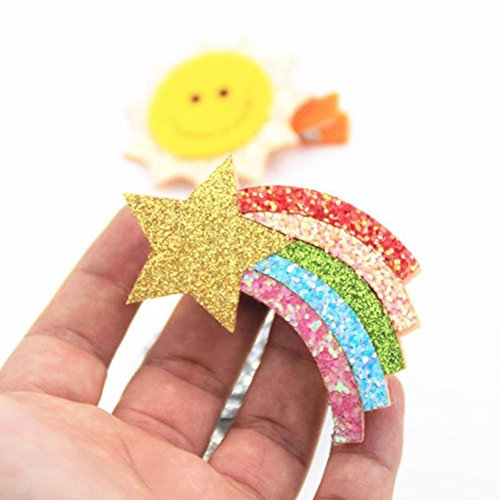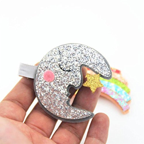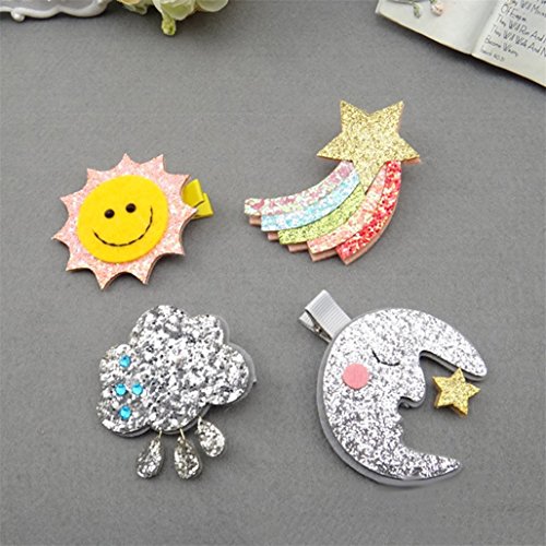 Studio : Bluelans Publisher : Bluelans Binding : Apparel Product Description Specifications: Catch this beautiful accessory for your baby girl. Super cute and lovely baby girls' hair-wear. Match with suitable apparel for different occasions. Type: Hair Clip Gender: Kid Girls' Style: Fashion Material: Fabric Shimmering Powder Features: Star and Rainbow, Sun, Cloud, Moon, Shimmer, Cartoon, Lovely Sun Diameter: 5.5cm/2.17" (Approx.) Sun's Clip Length: 5cm/1.97" (Approx.) Moon Half-round Diameter: 6cm/2.36" (Approx.) Moon Middle Width: 3.5cm/1.38" (Approx.) Moon Total Width: 5cm/1.97" (Approx.) Rainbow Length: 7.5cm/2.95" (Approx.) Rainbow Width: 3.5cm - 4cm/1.38" - 1.57" (Approx.) Cloud Size: 5.5cm x 6cm/2.16" x 2.36" (Approx.)
