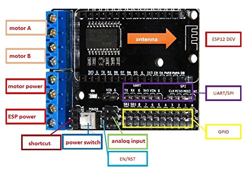 ESP8266 wifi motor drive expansion shield board for NodeMcu ESP-12E you could use this combination to control the robot smart car; ESP8266 wifi module can be widely use in daily life, such as wifi thermostat, wifi clock,wifi smart plug, wifi plant watering,wifi door alarm.The NodeMCU ESP8266 Kit Sample Tutorials( http://kookye.com/?p=3545);