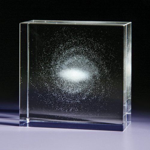 An Exquisite Combination of Art, Science, and Technology -- Own a true collector's item, created by Bathsheba Grossman - an internationally renowned artist, who uses laser beams to create works of art. Each pulse of the beam passes freely through the glass except at its focal point, where the concentrated energy causes a tiny fracture. These microscopic sparkles catch the light, forming a permanent design floating inside the crystal. -- These impressive crystals are available in two models - The Milky Way Galaxy and The Star Map. The Galaxy Crystal is a cosmic paperweight modeled after views captured at the NASA Goddard Space Flight Center. The bright stars along the spiral arms, the delicate disk, and the strongly barred core are drawn here as they look from intergalactic space. The Star Map Crystal outlines our cosmic neighborhood, 10 lightyears to the inch. Enjoy a 3-D map of all stars within 5 parsecs of the sun. -- The Star Map also ships with a key describing each star and symbol. Both models feature clear rubber feet, to avoid scratches on your desk or mantel. Without a stand, it works best against a dark background. The Galaxy Model is sized at 3 1/2" square by 1 3/4". The Star Map measures 3" square.Feature