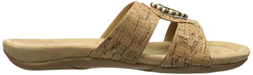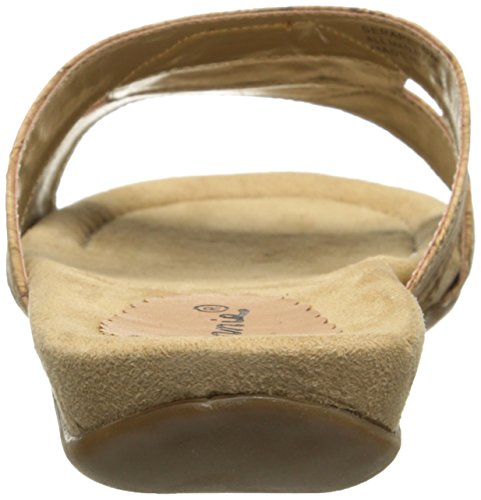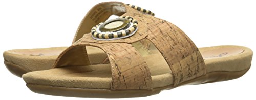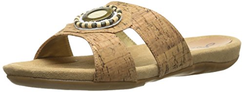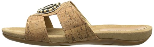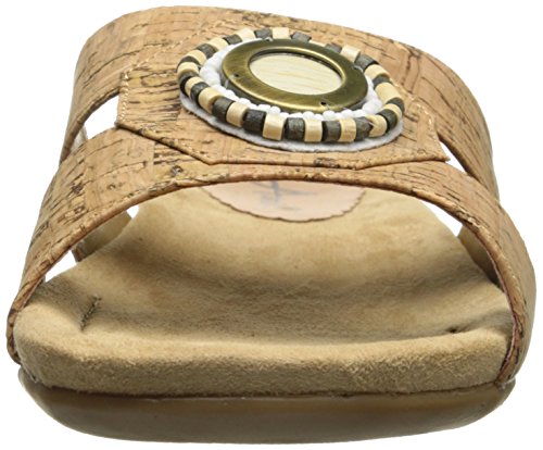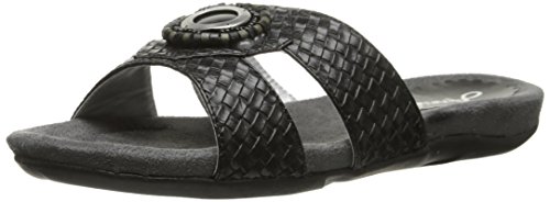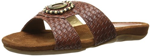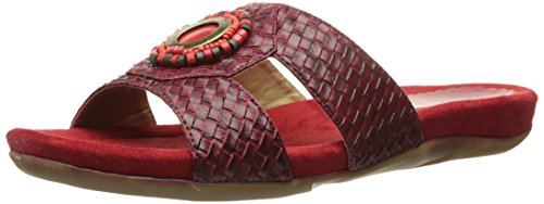 The Serape woven slide features a T-strap upper with beading and a metal ornament at the center.