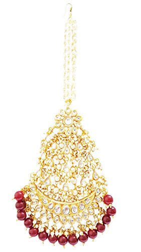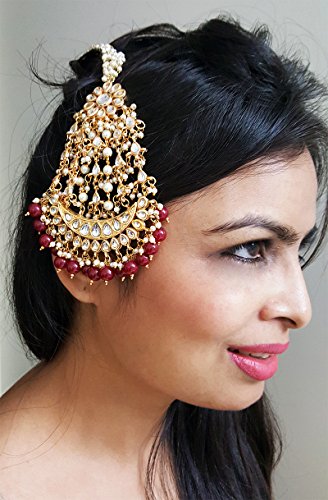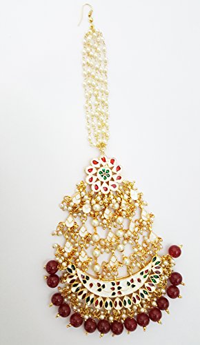 -. Feature : Heavy ethnic statement piece in gold tone, kundan , pearls & simulated rubies jhumar passa. It's part of our traditional imitation jewelry collection. / Perfect gift for girls / women. / Unique style, one of a kind and can be worn for any occasion / Length: 22 cm, Width: 9 cm, Weight: 62 gm. (Approx.) / Avoid contact with water and sprays.