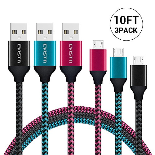 Cell Phone Micro USB Cable, EVISTR 3PACK 10FT Durable Nylon Braid Cell Phone Charging Cable USB 2.0 A Male to Micro B Sync Data Cable Cord for Samsung MOTO Nexus LG HTC Android Phone (10FT / 3PACK)