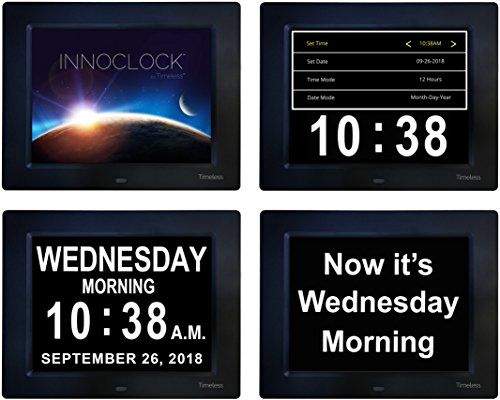 The INNOCLOCK by Timeless is a state-of-the-art clock featuring a large, clear display that can be hung on a wall (using its rear mount hole), or stood on a table, nightstand, shelf or desk (using its pull-out stand). It's great for the home, office, lab and classroom, and especially for seniors and those who benefit from seeing the time and date spelled out and free from abbreviations. Incredibly easy to set up and use. Includes eight built-in languages - English, Spanish, French, German, Italian, Polish, Dutch and Welsh. Powered by included AC adapter (100-250V) with approx 6' (1.8m) long cable. Give the gift of confidence and happiness - buy an INNOCLOCK for your loved ones today!