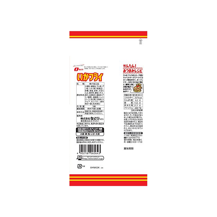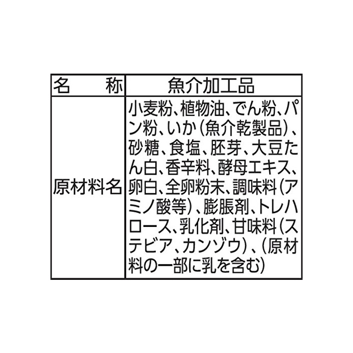 원재료:소맥분,식물성 기름,나오지 않겠 분,빵가루,가다(생선 및 조개류건 제품)고, 설탕,식염,배아,대두 단백,향신료,효모 엑기스,계란 흰자,전알 분말,조미료(아미노산등)고, 팽창 제,트레이닝 헬로《스》,유화 제,감미료(스테 비어,캔 코끼리)고,(원재료의 일부에 젖을 포함한다)