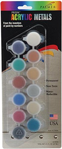 Palmer Prism Metals and Pearls Acrylic Paint Pots. A wide spectrum of colors in handy reclosable pots, ideal for use on wood, Styrofoam, fabric, plaster, canvas, paper and more. These paints are non-toxic, water reducible and permanent when dry. This package contains twelve paint pots (total of 2-1/4 ounces) and one paint brush. Conforms to ASTM D4236. Made in USA.Feature